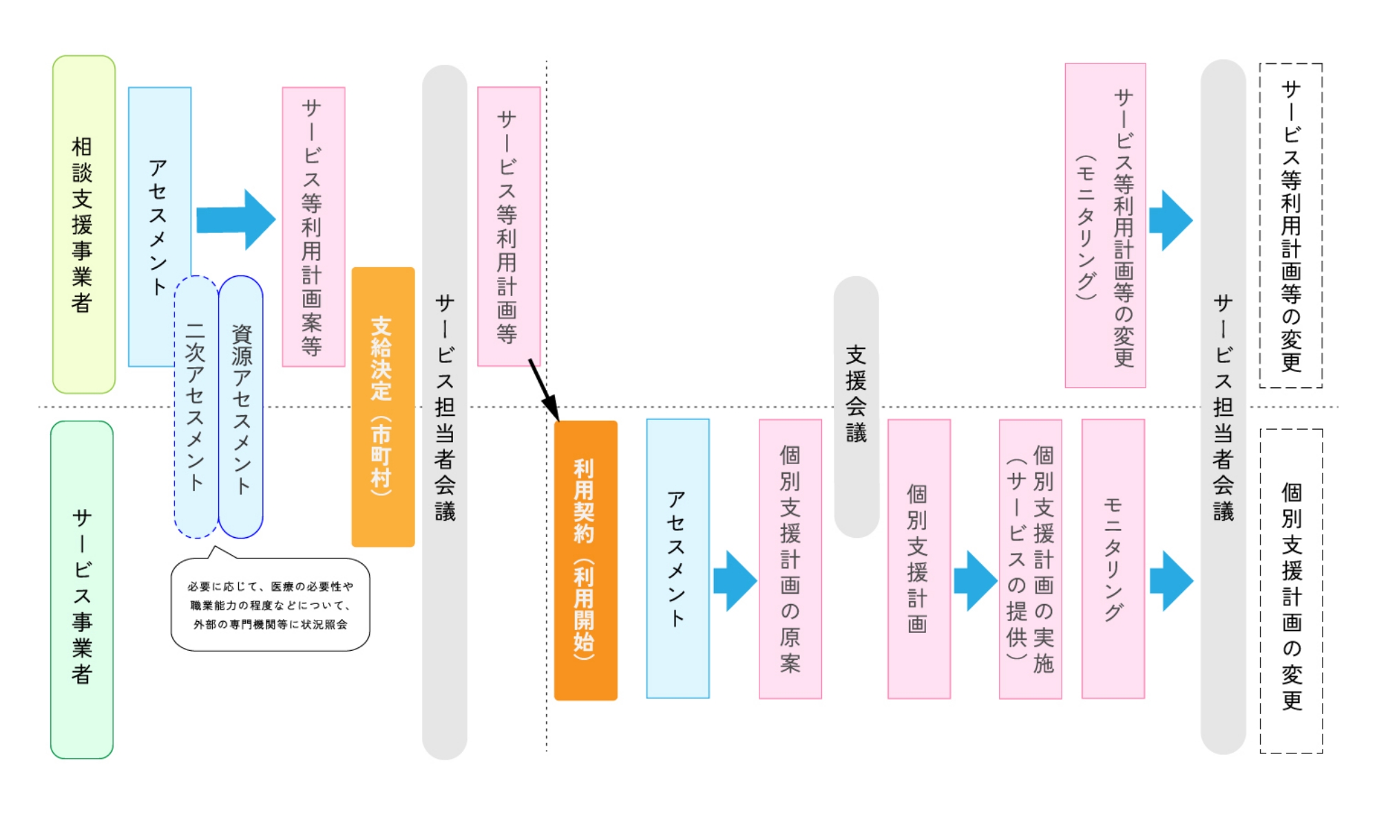 「サービス利用計画」と「支給決定内容」に基づき、サービス提供事業者とサービス担当者で会議・契約等を実施します。 その後、サービス利用開始となります。